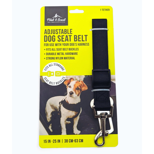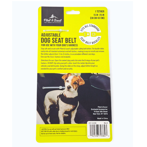 This Adjustable Dog Car Seat Belt is designed to help keep dogs safely restrained while riding inside a vehicle. The seat belt clips easily into standard car seat belt buckles and connects securely to a dog’s harness (not for use with collars). The adjustable tether length, 15–25 inches (38–63 cm), allows flexibility for dogs of different sizes while limiting excessive movement during travel.