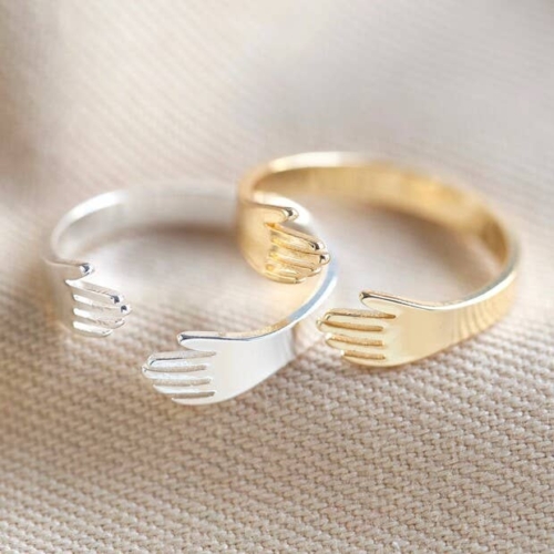 Unique hugging hands ringSilver toned brass alloy. Adjustable in sizeFormed of a curved band with tiny hands on each end to create a hugging effect when worn on your finger.