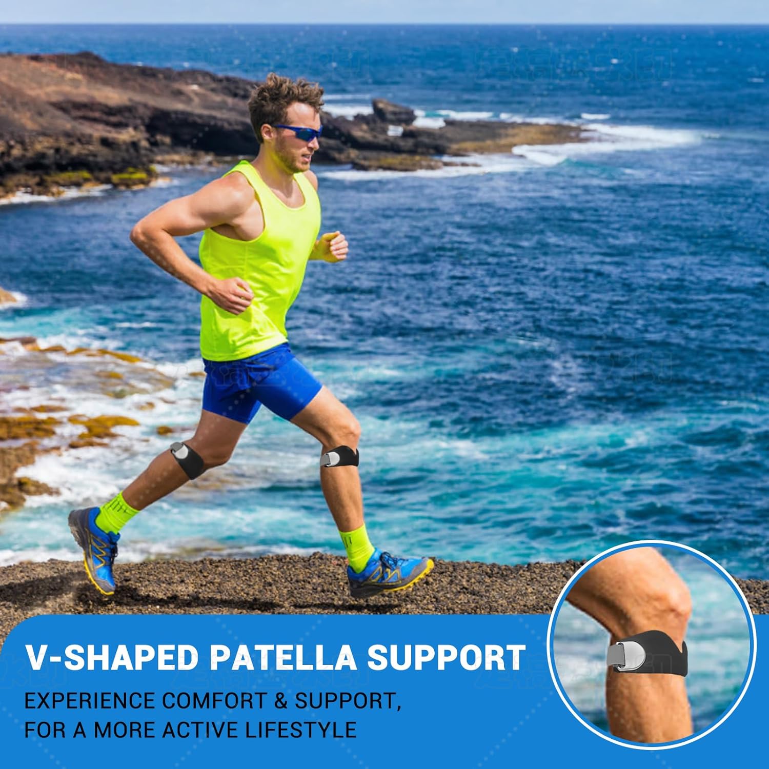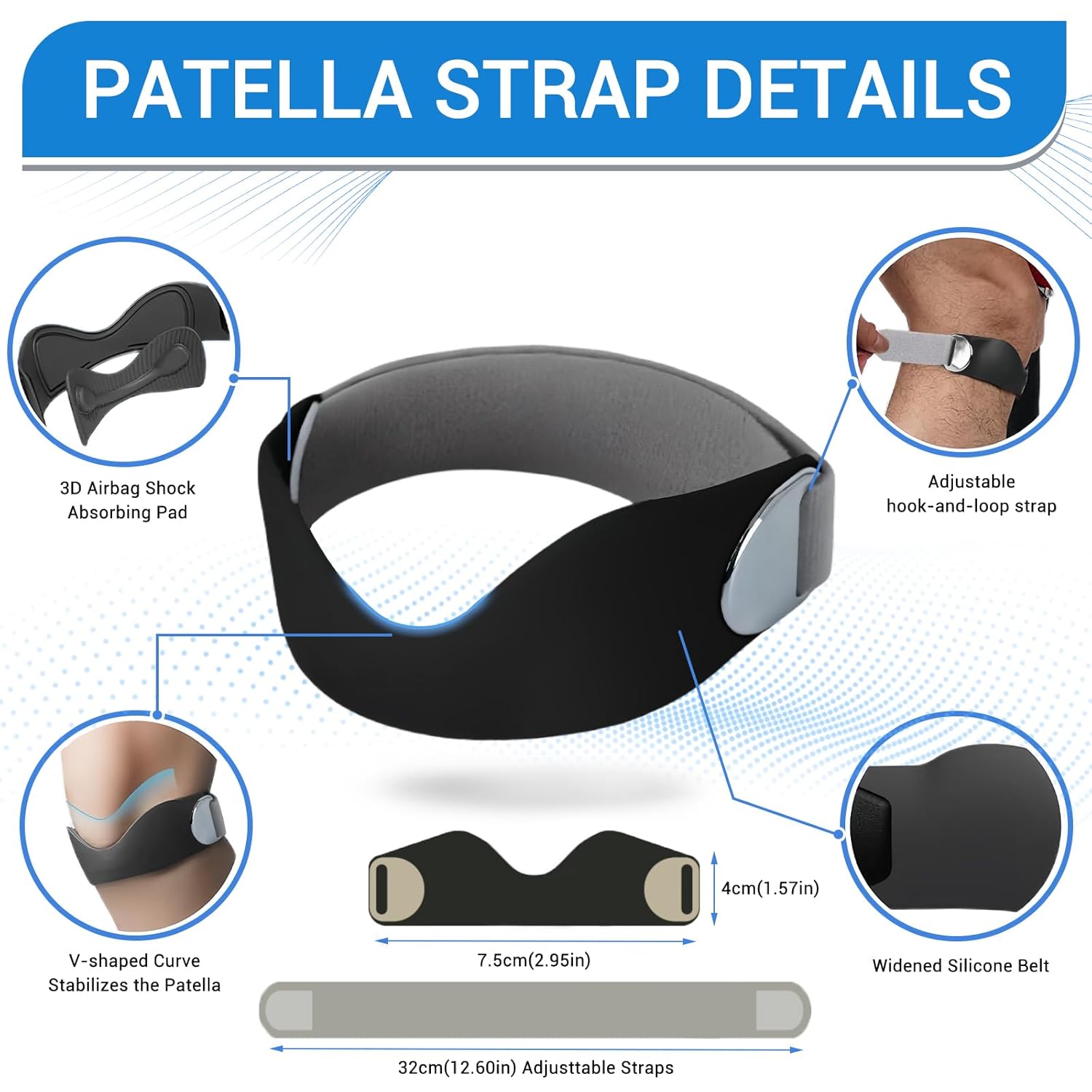 Butterfly Patella Support: Ergonomically designed to stabilize the kneecap and reduce pressure on the meniscus during movementDual-Adjustment Buckles: Customize tightness for a secure fit without restricting blood flowSoft Silicone & Breathable Fabric: Prevents chafing and irritation, ideal for prolonged wearOne Size Fits Most: Stretchy material accommodates calf circumferences from 12” to 20”Versatile Use: Perfect for running, weightlifting, hiking, or recovery from minor knee discomfort