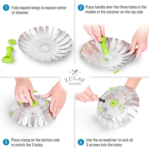 Make quick and easy healthy meals throughout the week instead of resorting to takeout with Zulay Kitchen Food Steamer. Made of rust-resistant premium quality stainless steel with food-grade silicone feet for worry-free cooking. This foldable vegetable steamer basket can be used to conveniently steam delicious veggies, sumptuous seafood, eggs, or dumplings in one go while preserving the nutrients, vitamins, and minerals in your food upon cooking.