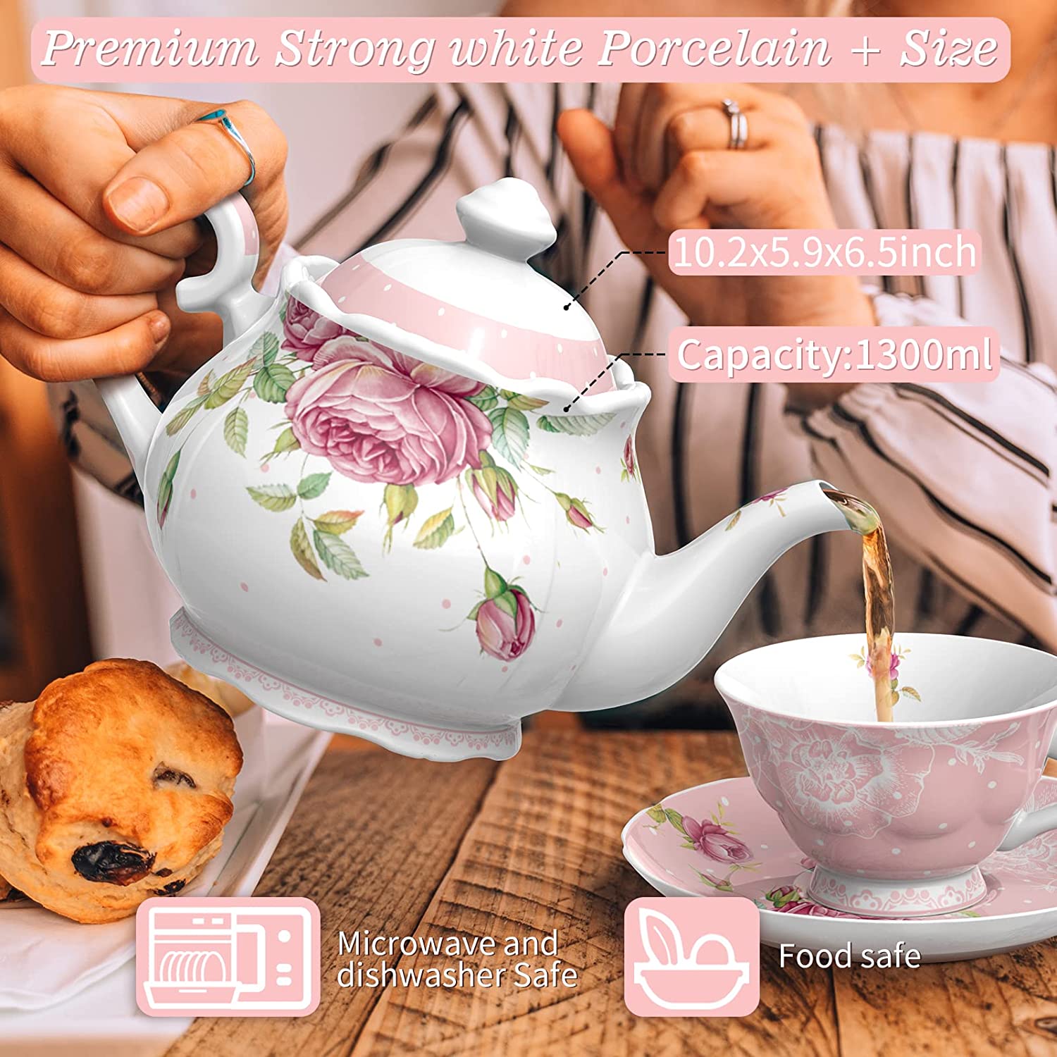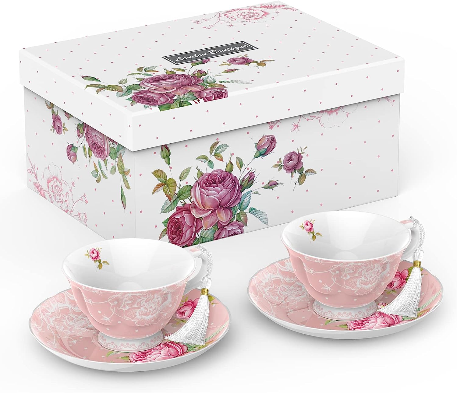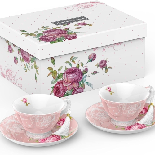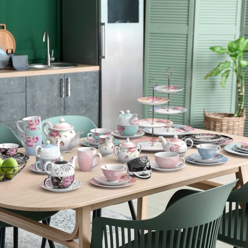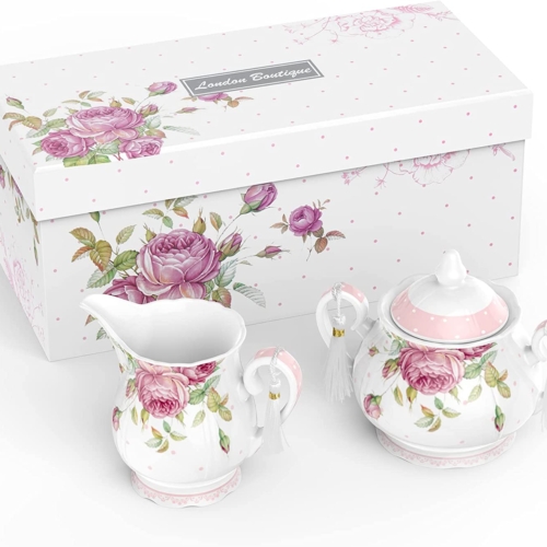 After Tea Coffee Set in Pink Rose Pattern Teapot Set, 2 Cups/ 2 Saucers Cake StandAn opportunity to acquire this Afternoon Tea Set in the Rose Pattern at a bargain price- Teapot, Milk jug and Sugar bowl- £52.75- 3 Tiered Cake Stand- £26.75- 2 Cups/ 2 Saucers- £26.75Buy it for £94.75 and save £11.50TEAPOT, MILK JUG AND SUGAR BOWLWhat in the Package: Teappt set comes Teapot, milk jug and Sugar bowl; Teapot Only come with 1300ml large teapot, lid, and gift box. Mila Jug and Sugar bowl set comes with large milk jug and sugar bowl. Vintage British Shabby Chic design in glazed white china. Teapot with build in filter at end of the sprout, suitable for loose tea.Size and Capacity — Teapot: 1300ml; Size: 10.2×5.9×6.5inches; Milk jug: 400ml, Size: 4.7x4x3.7 inches; Sugar Bowl: 350ml, 5.8×4.7x4inchesFood Safe — No lead, meet food safety standard. Made with premium qulity of porcelain, no bone ash. Bright white colour give it elegant touch.Perfect Gift — Taylor made gift box matching the design of the cake stand, perfect gift idea for the loved ones, or treat for yourselfPremier Quality — Made with premier quality of porcelain, no animal bone ash, suitable for vegan and vegetarian. Glazed white Chinaware, with vintage shabby chic flora rose designDishwasher and Microwave safe2 CUPS/ 2 SAUCERSThe Package: 2teacups, 2 saucers and a gift box; Vintage British Shabby Chic design in glazed white chinaSize and Capacity — Cup: 200ml 7oz, 5×2.4inches; Saucer: 15.5cm 6inchesFood Safe — No lead, meet food safety standard. Made with premium quality of porcelain, no bone ash. Bright white colour give it elegant touch.Perfect Gift — Taylor made gift box matching the design of the teacup and saucer set, perfect gift idea for the loved ones, or treat for yourself3 TIERRED CAKE STANDPremier Qulity — Made with premier quality of porcelain, no animal bone ash, suitable for vegan and vegetarian. Glazed white Chinaware, with vintage shabby chic flora rose designSize — Large 10.7 inches, Medium 7.6inches, Small 6.1 inches; Height of the cake stand is 13 inches. 3 of the plates have a hole in the middle for the fittings; Silver matel fittings with instruction of assembly; 4 Colours: Black, Turquoise, Blue and Pink; Vintage British Shabby Chic design in glazed white chinaFood Safe — No lead, meet food safety standard. Made with premium qulity of porcelain, no bone ash. Bright white colour give it elegant touch.Perfect Gift — Taylor made gift box matching the design of the cake stand, perfect gift idea for the loved ones, or treat yourselfMicrowave and Dishwasher safe