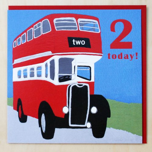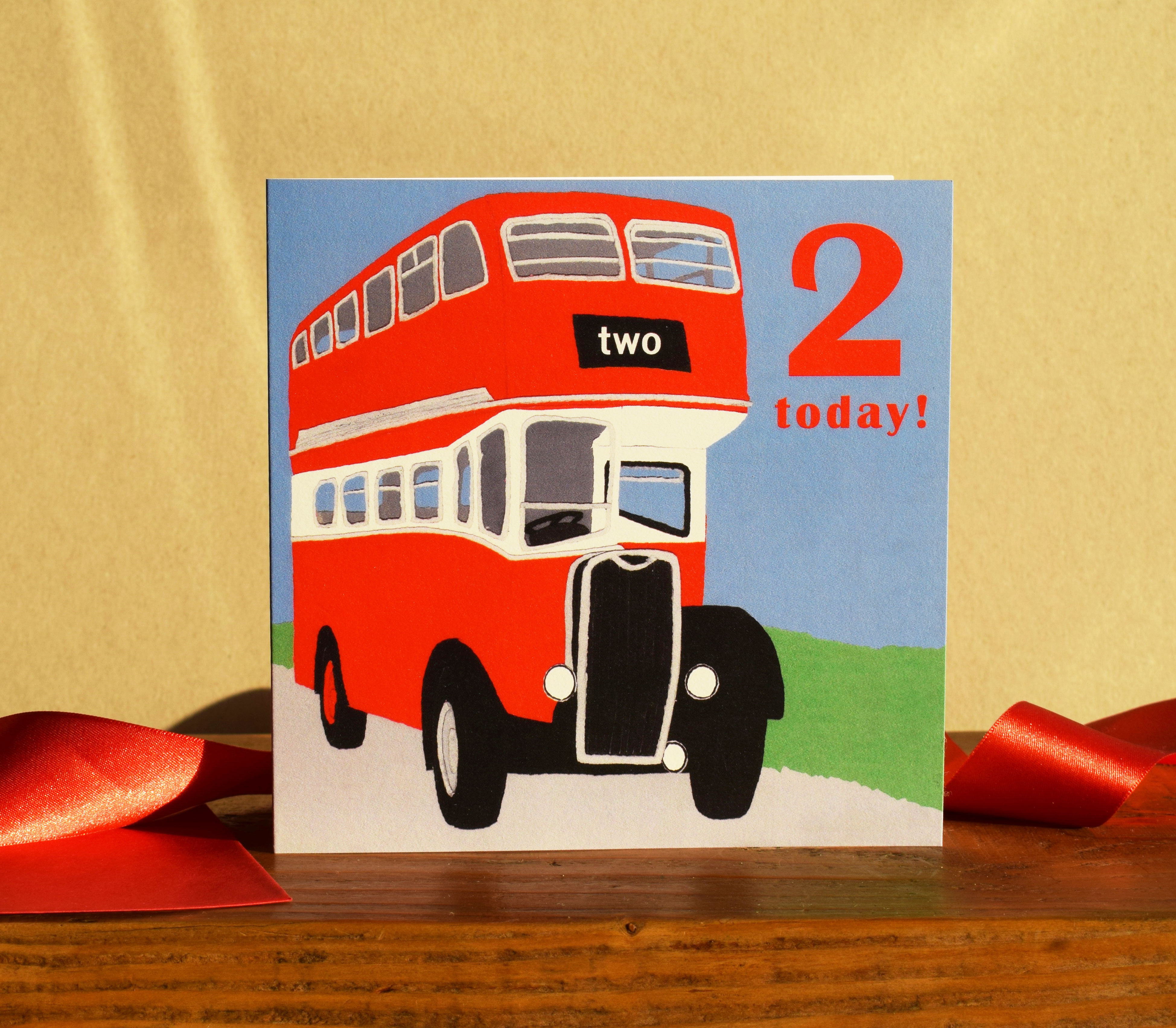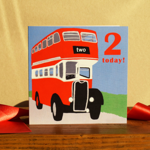 A bright and simple image of a vintage Red Bus. Ideal age 2 birthday card for the young bus and vehicle enthusiast.