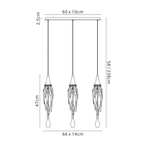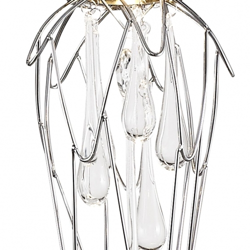 Agnes is a range of multiple pendants that takes the concept of a melting icicle one step further, not only using long clear crystal drops that mimic a falling drop of water but also shaping the frame which hosts them into a similar statement. The polished chrome metal frames are bent and curved like slowly cascading water which the smaller crystal drops and GU10 lampholders sit inside.