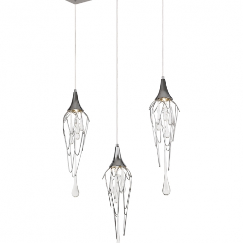 Agnes is a range of multiple pendants that takes the concept of a melting icicle one step further, not only using long clear crystal drops that mimic a falling drop of water but also shaping the frame which hosts them into a similar statement. The polished chrome metal frames are bent and curved like slowly cascading water which the smaller crystal drops and GU10 lampholders sit inside.