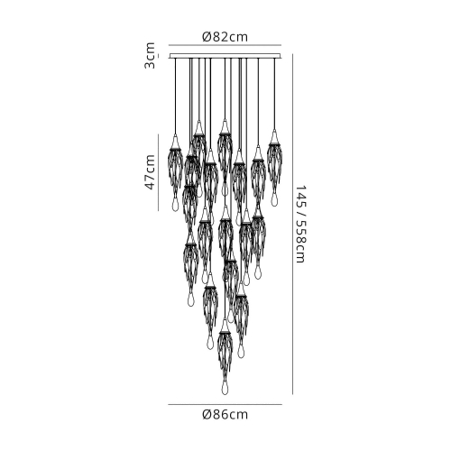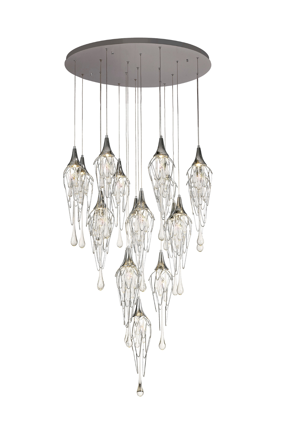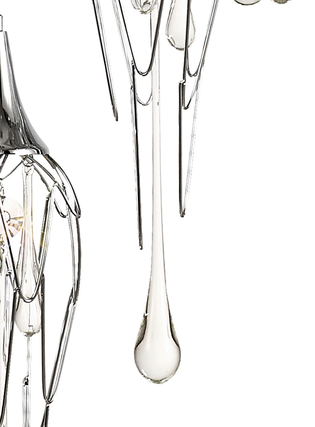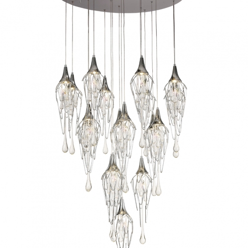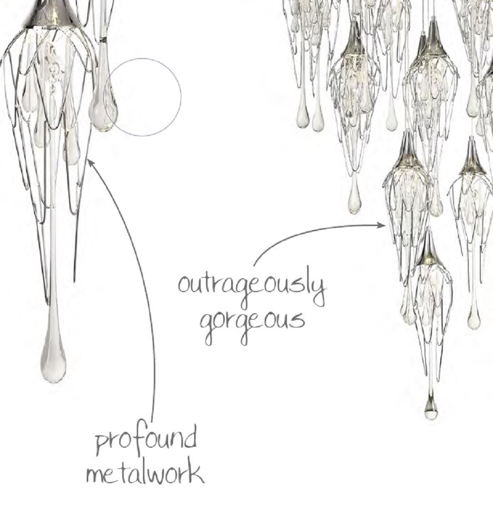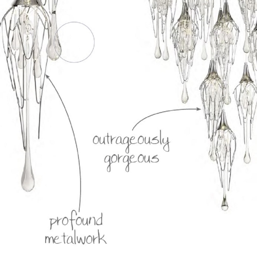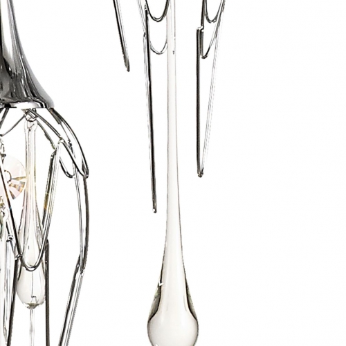 This range of multiple pendants, takes the concept of a melting icicle one step further, not only using long clear crystal drops that mimic a falling drop of water but also shaping the frame which hosts them into a similar statement. The polished chrome metal frames are curved like slowly cascading water which the crystal drops and GU10 lampholders sit inside.