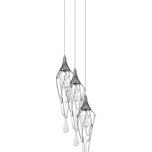 Agnes is a range of multiple pendants that takes the concept of a melting icicle one step further, not only using long clear crystal drops that mimic a falling drop of water but also shaping the frame which hosts them into a similar statement. The polished chrome metal frames are bent and curved like slowly cascading water which the smaller crystal drops and GU10 lampholders sit inside.
