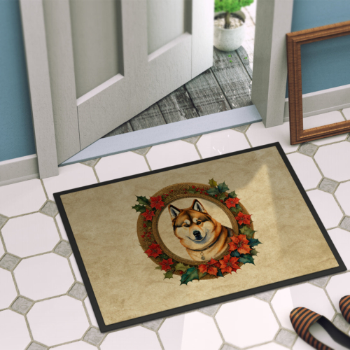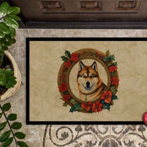 Doormat featuring breed specific Akita artwork. Celebrate Christmas with this Christmas Doormat. Welcome your guests in style with our Artwork Door Mat, designed to withstand almost any weather condition. This mat, measuring approximately 18 by 27 inches, is held together by durable black binding tape. Its top layer, composed of polyester felt, is dyed with the eye-catching image you see on the mat. A few layers below provide the mat with stability, while its rubber bottom is stamped to help prevent slipping and ensures safety. Our mat works wonderfully as both an indoor or outdoor door mat. For cleaning, simply hose it off with water or use a power washer – no need for any cleaner that produces suds. Avoid scrubbing with a brush, instead, opt for the vacuum on floor setting. Designed manufactured and printed in the USA, this mat is a perfect addition to your porch, outdoor kitchen, entryway, or any indoor space. Its unique design makes it a charming decorative rug that greets your guests and adds a stylish touch to your home decor.