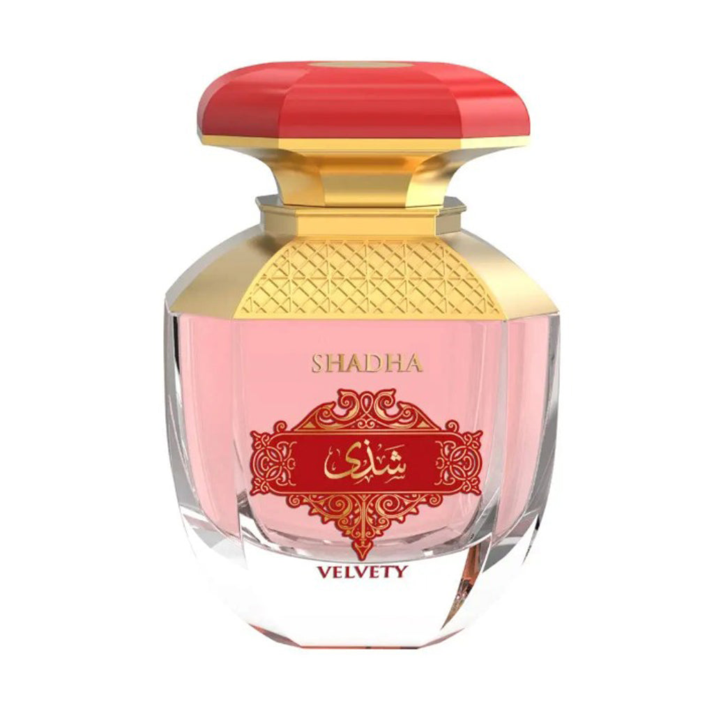 Shadha Velvety where citrus spark meets floral elegance, wrapped in a creamy, woody embrace. Unveil your bold softness with every sensual spritz. Head: Mandarin Orange, Coriander, Bergamot, Bitter Orange Heart: Saffron, Orange Blossom, Geranium, Jasmine Sambac, Rose Base: Woody Notes, Tonka Bean, Vanilla
