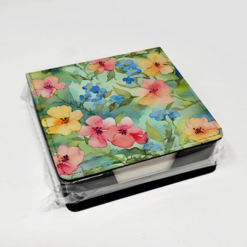 PU Leather Note Paper Holder featuring breed specific Alaska Forget-me-nots artwork. Elevate your workspace with this PU Leather Note Paper Holder, crafted to resemble luxurious leather without the use of animal products. Made from durable synthetic PU leather, it offers both a premium look and eco-friendly appeal. This note holder, compactly sized at 4.25 x 4.25 x 1.25 inches, includes about 160 sheets of 3.75 x 3.75-inch note paper—ideal for quick notes and reminders. An exclusive artist-designed cover makes each holder uniquely vibrant, adding a splash of color and personality to any desk or office. The discrete design keeps note paper hidden, maintaining a neat and organized workspace. Perfect as a gift or for personal use, this stylish holder is refillable with standard paper, ensuring long-lasting utility. A must-have for anyone seeking a sophisticated, artful touch to their workspace while supporting animal-friendly products. Add style, organization, and creativity to your everyday routine with this elegant note paper holder.