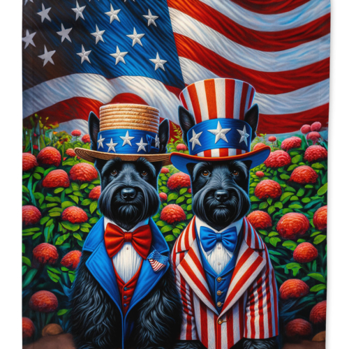 House Flag featuring breed specific Scottish Terrier artwork. Presenting our Heavy Duty Polyester House Size Decorative Sleeve Pole Flag, a vibrant addition to enhance the aesthetic appeal of your home. This large decorative flag, measuring approximately 28 x 40 inches, offers ample coverage and visibility. Each flag is meticulously sewn and made individually, ensuring a unique piece that may slightly vary in size. It’s a sleeve pole flag, designed to fit a standard decorative flag pole effortlessly. Please note that the flag pole and bracket are not included and should be purchased separately. What sets our flag apart is its dual-sided print. The design is mirrored on both sides of the fabric, allowing for uniform visibility regardless of the angle. Printed in full color, our flag showcases vibrant hues that truly stand out. To ensure lasting vibrancy and durability, the dyes are heat-set into the fabric. This ensures your flag remains bright and captivating through various weather conditions. Elevate the look of your home with our Heavy Duty Polyester House Size Decorative Sleeve Pole Flag!