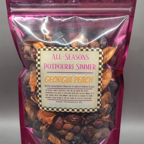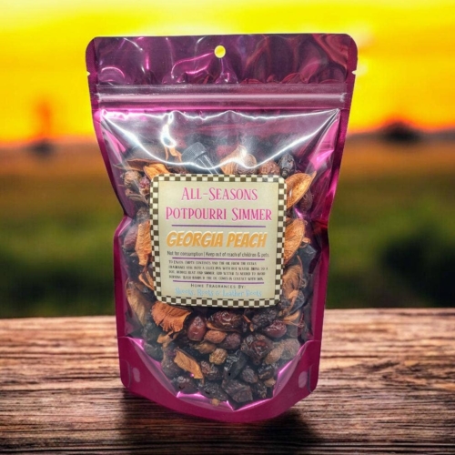 Our most popular scents are now available in a simmer! Our Georgia Peach Simmer comes in a 5x3x9 fuchsia stand-up zipper pouch. Although the simmers come highly scented, I have included an extra 1 ml fragrance oil vial for even more scent! Georgia Peach is AMAZING! Try it, you’ll agree. To enjoy- Pour the contents + the extra oil into a saucepan or crockpot with at least 2 cups water. Simmer on low and allow the vapors to freshen your home. Do not boil dry. Do not consume.