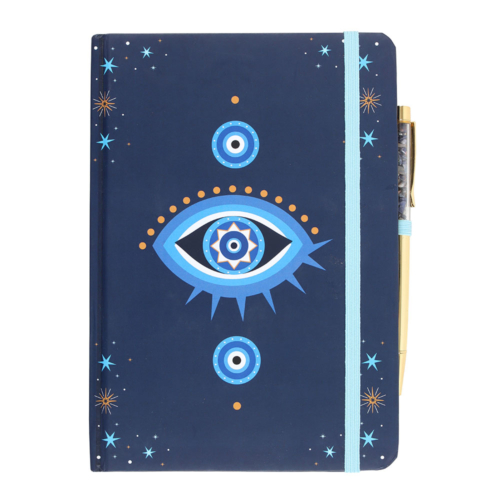 Jot down your thoughts, dreams or cosmic plans with this A5 notebook featuring a dark blue all seeing eye design with star accents and a matching light blue page marker. Includes a crystal chip-filled gold-tone pen for a touch of mystical flair. 100 sheets / 200 lined pages. Designed by Something Different Wholesale and part of the Starry Eyed collection of celestial gifts and home décor.