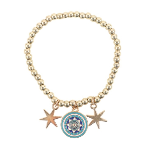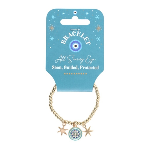 Radiate mystical style with this gold-tone beaded charm bracelet featuring an all seeing eye charm and two delicate star charms. Elasticated for a comfortable fit, it comes attached to a turquoise hanging tag with the words ‘Seen, Guided, Protected’- a thoughtful token for yourself or someone special. May contain traces of nickel and is made from alloy in accordance to REACH specification. Designed by Something Different Wholesale and part of the Starry Eyed collection of celestial gifts and home décor.