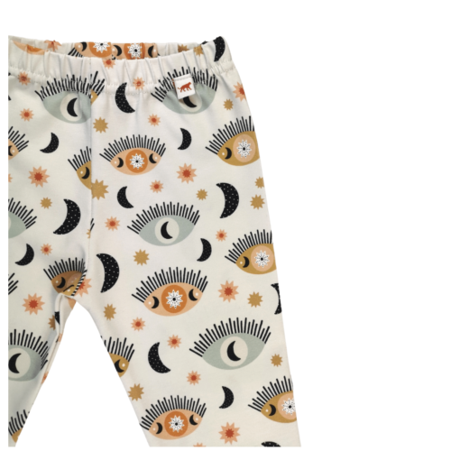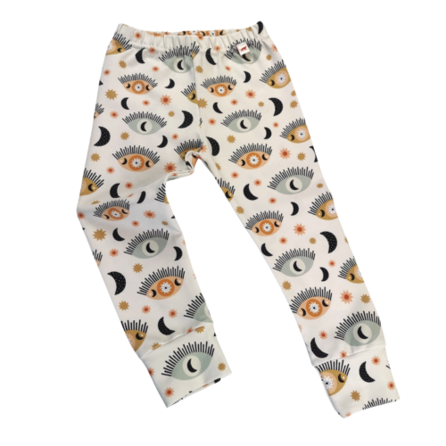 House of Margaux, handmade, full-length cream leggings are decorated with an all-over eye print. They have a soft elastic waist and cuffs at the ankles for the perfect fit.