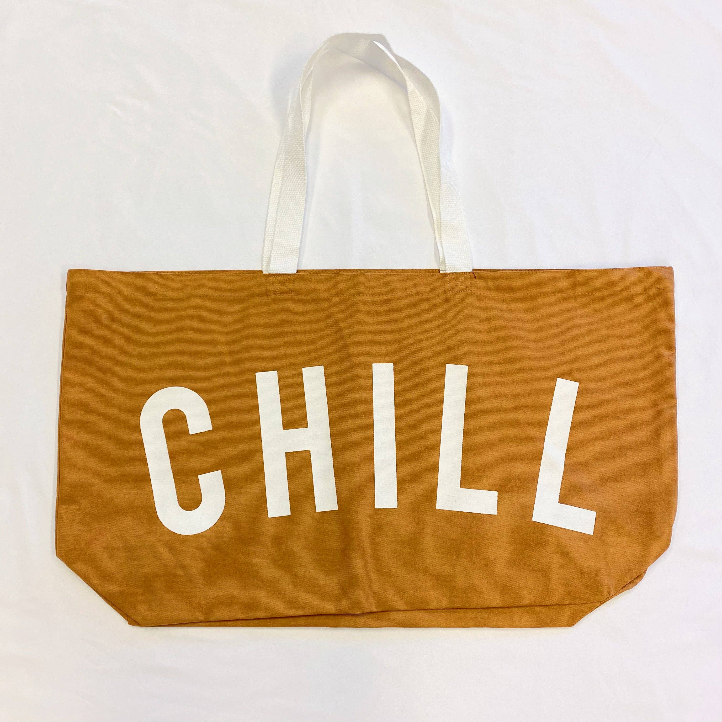 This tote can fit anything and everything! Made from great quality canvas material and detailed with a nice font “CHILL”. Show your love for the earth with these reusable eco bags. The perfect tote for beach days, bachelorette trips, laundry bag, weekender and more! Dimensions: approximately 26” x 7” x 15” Ethically sourced, reusable, recyclable, no plastic packaging Machine washable cold gentle cycle and hang dry Made in China
