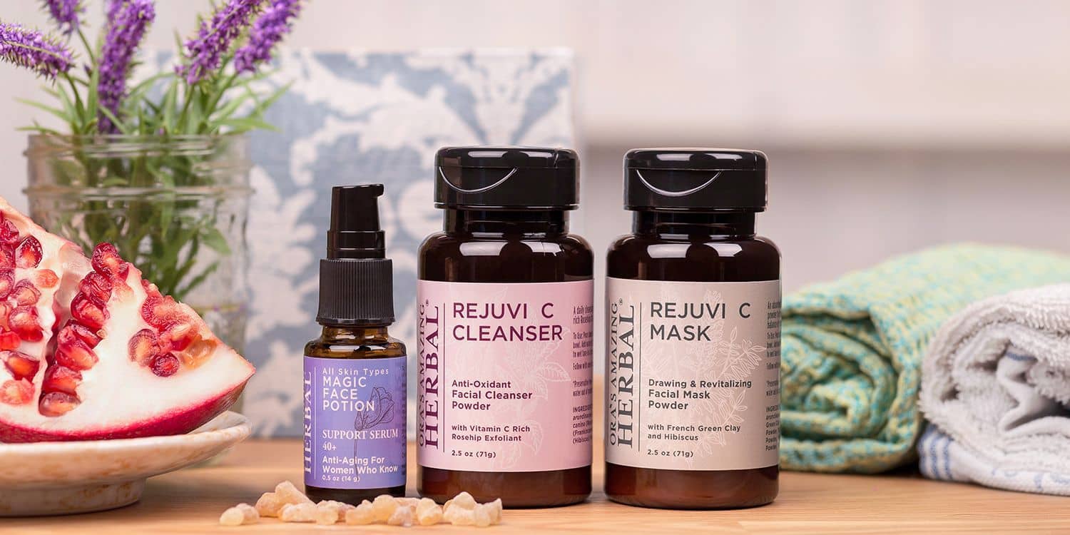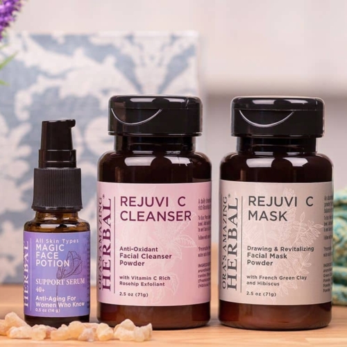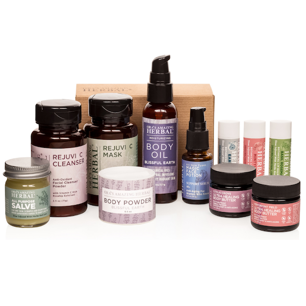 Take Amazing care of your skin with pure botanicals! This luxurious natural skin care set contains a wide selection of our herbal infused and botanical skincare. A Rejuvi C Cleanser and Mask Set, Magic Face Potion, three aromatherapy lip balms, a travel size Citrus Grove Ultra Healing Body Butter, a travel size Peppermint Field Ultra Healing Body Butter, a travel size Blissful Earth Body Powder, a 2 oz Blissful Earth Body Oil and a 1 oz All Purpose Salve. Wow that’s an Amazing gift!