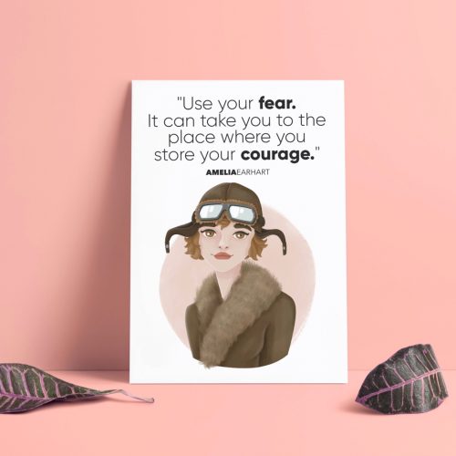 Design: Original illustrated portrait of Amelia Earhart with a quote which says: