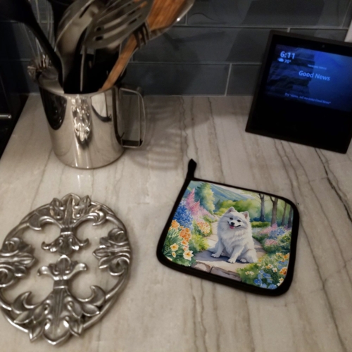 Pair of Pot Holders featuring breed specific American Eskimo artwork. A Pair of Pot Holders to match your kitchen decor. Made in the USA these are thick and functional. Full color artwork decorates the front polyester fabric of the hot pad and accented by a black trim. Use these at as a trivet for your Thanksgiving or Christmas tablescape. Filled with insulated fabric and quilted for durability. These colorful pot holders will make a great gift for your favorite home cook or executive chef. Each pot holder measures approximately 7 1/2 inches by 7 1/2 inches. A hanging tab is included.