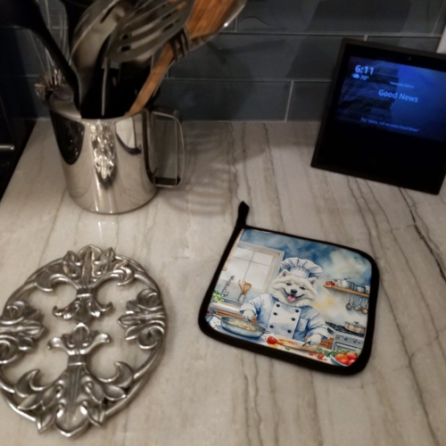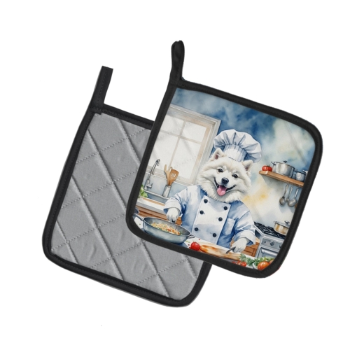 Pair of Pot Holders featuring breed specific American Eskimo artwork. A Pair of Pot Holders to match your kitchen decor. Made in the USA these are thick and functional. Full color artwork decorates the front polyester fabric of the hot pad and accented by a black trim. Use these at as a trivet for your Thanksgiving or Christmas tablescape. Filled with insulated fabric and quilted for durability. These colorful pot holders will make a great gift for your favorite home cook or executive chef. Each pot holder measures approximately 7 1/2 inches by 7 1/2 inches. A hanging tab is included.