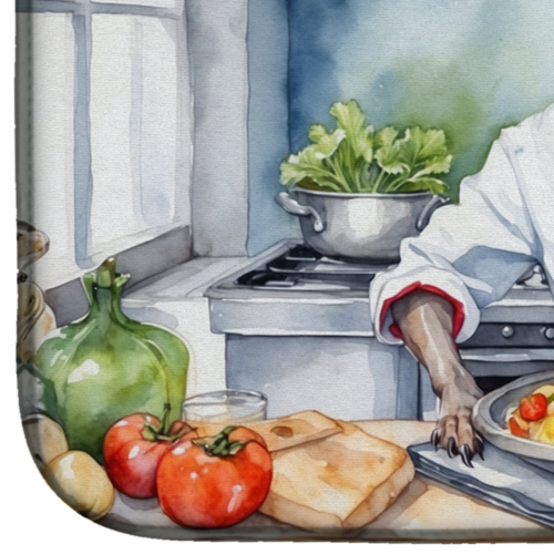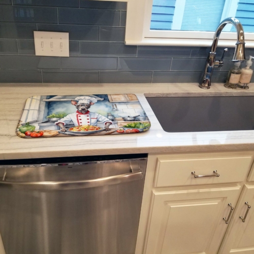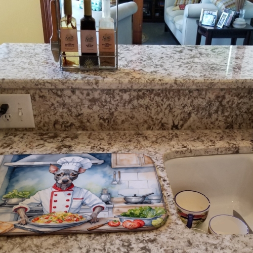 Dish Drying Mat featuring breed specific American Hairless Terrier artwork. Say goodbye to messy countertops and soggy dish towels with our innovative dish drying mat. Our high-quality dish drying pad is designed to keep your countertops dry while offering a stylish and efficient solution. Whether you’re air drying dishes, glasses, stemware, silverware, pots, pans, bottles, or even fruits and vegetables, our dish mat is the perfect choice. The 14 inches x 22 inches size fits most counters and dish drying racks, and the non-slip design ensures stability. Made with water-absorbent polyester and a polyurethane foam insert, our dish drying mat is not only functional but also durable. It’s machine washable and printed in the USA for long-lasting use. The beautiful artwork adds flair to your kitchen decor, making it a perfect housewarming gift or present for any occasion. Upgrade your kitchen experience with our absorbent and versatile dish drying mat.