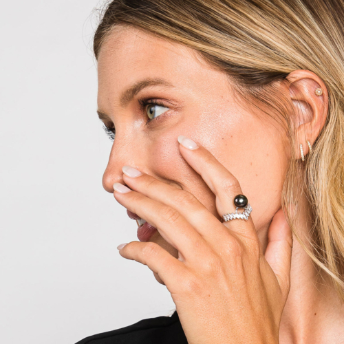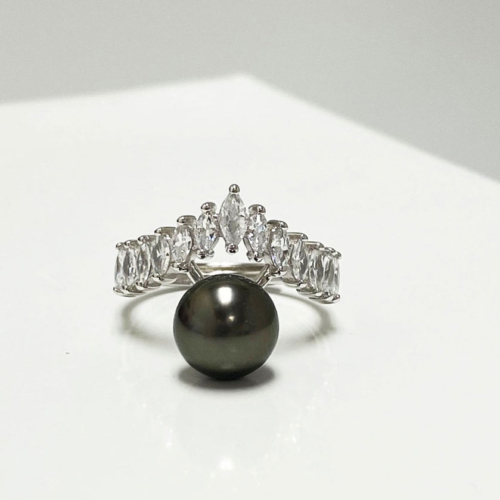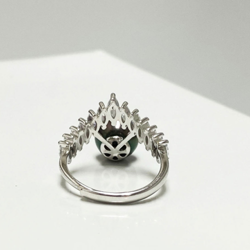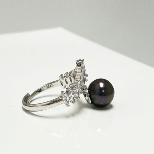 This breathtaking Tahitian pearl princess ring features a exquisite Tahitian cultured pearl embellished by a string of beautiful white stones almost as if this royal pearl was wearing a crown. product detailsProduct Type: Ring (adjustable)Product Measurements: 1.07″X1.24″Pearl Type: Tahitian PearlPearl Size: 9.2mmPearl Color: Black with Green overtoneMetal Type: S925Stone Type: Zircon Tahitian Cultured PearlsTahitian cultured pearl or black pearls, don’t just come in the colors of grey, black and brown, in fact, they will almost certainly display blue to green, copper, purple, yellowish green or pink overtones. In the pearl industry, the term “pistachio”, “aubergine”, or “peacock” is often used to vividly describe the Tahitian pearl color. Pearl Care & Additional Information