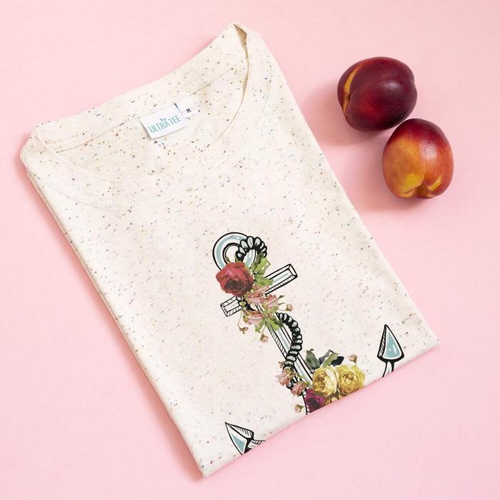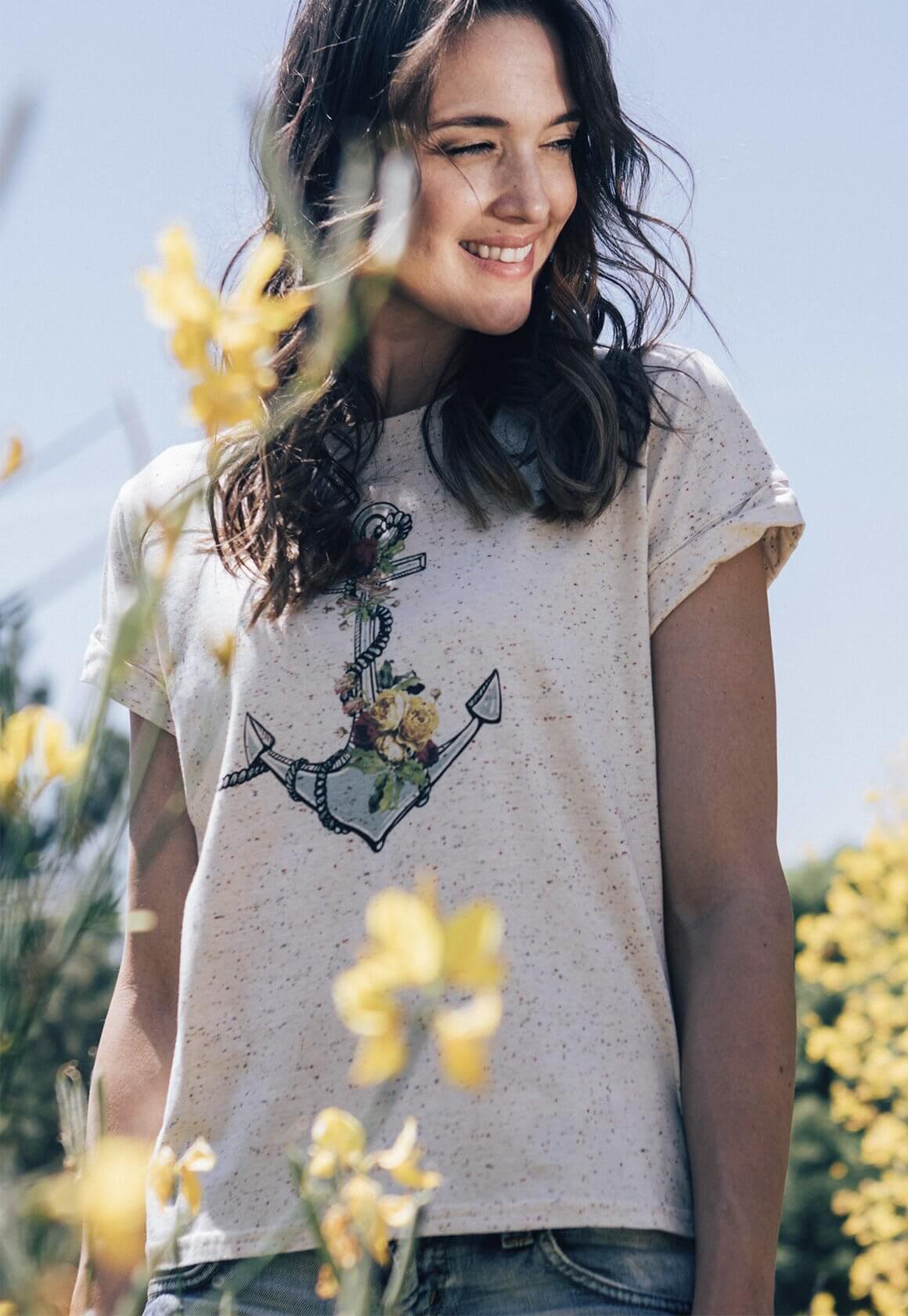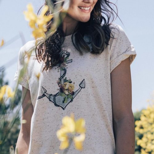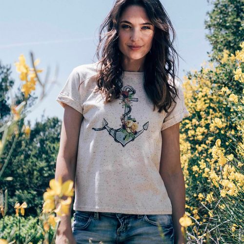 Anchor Speckled Tee made of 96% cotton, 4% polyester. Pair it with your favourite jeans and sneakers or a skirt. Here are some features: Crew neck. Color : cream with multicolor neps. Short and rolled-up sleeves. Boxy fit. This tyle is slightly cropped. Model wears Medium size. Model hight: 173cm / 5’8″. Made with love in Portugal and printed in France. Our recommendations: Wash inside out with similar colors at 30°. Iron inside out at low to medium temperature. No bleaching. Do not iron on decoration directly
