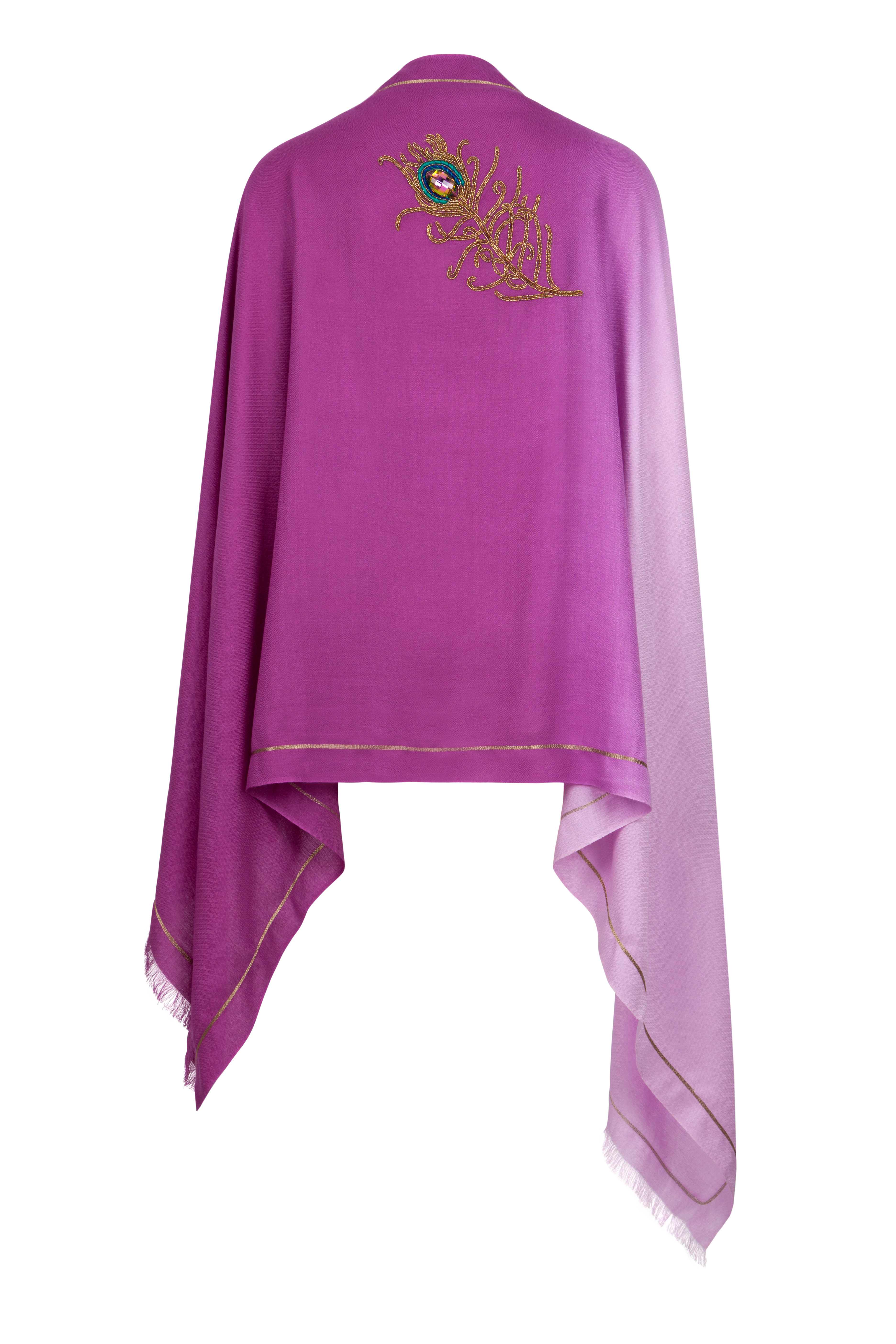 This scarf has been lovingly hand-made in India by skilled Indian artisans, made from a fine weave blend of cashmere and modal, hand-dyed, with an ombré finished and an intricate, gold embroidered feather, completed with a beaded glass crystal, and a fine gold weave trim.