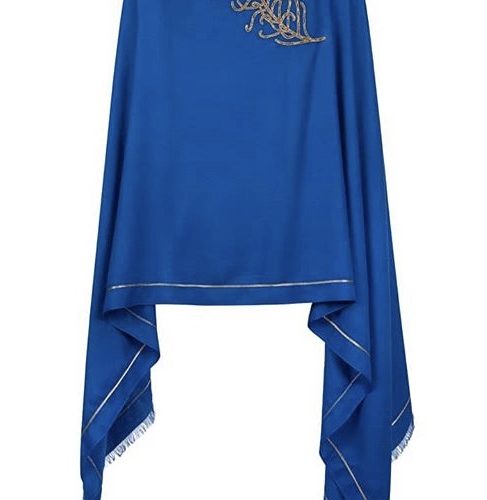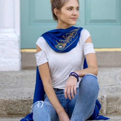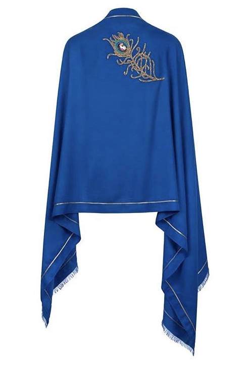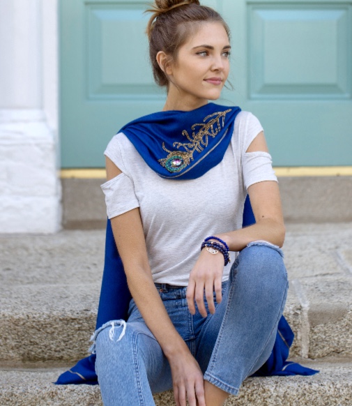 This scarf has been lovingly hand-made in India by skilled Indian artisans, made from a fine weave blend of cashmere and modal, hand-dyed, with an intricate, gold embroidered feather, finished with a beaded glass crystal, and a fine gold weave trim.