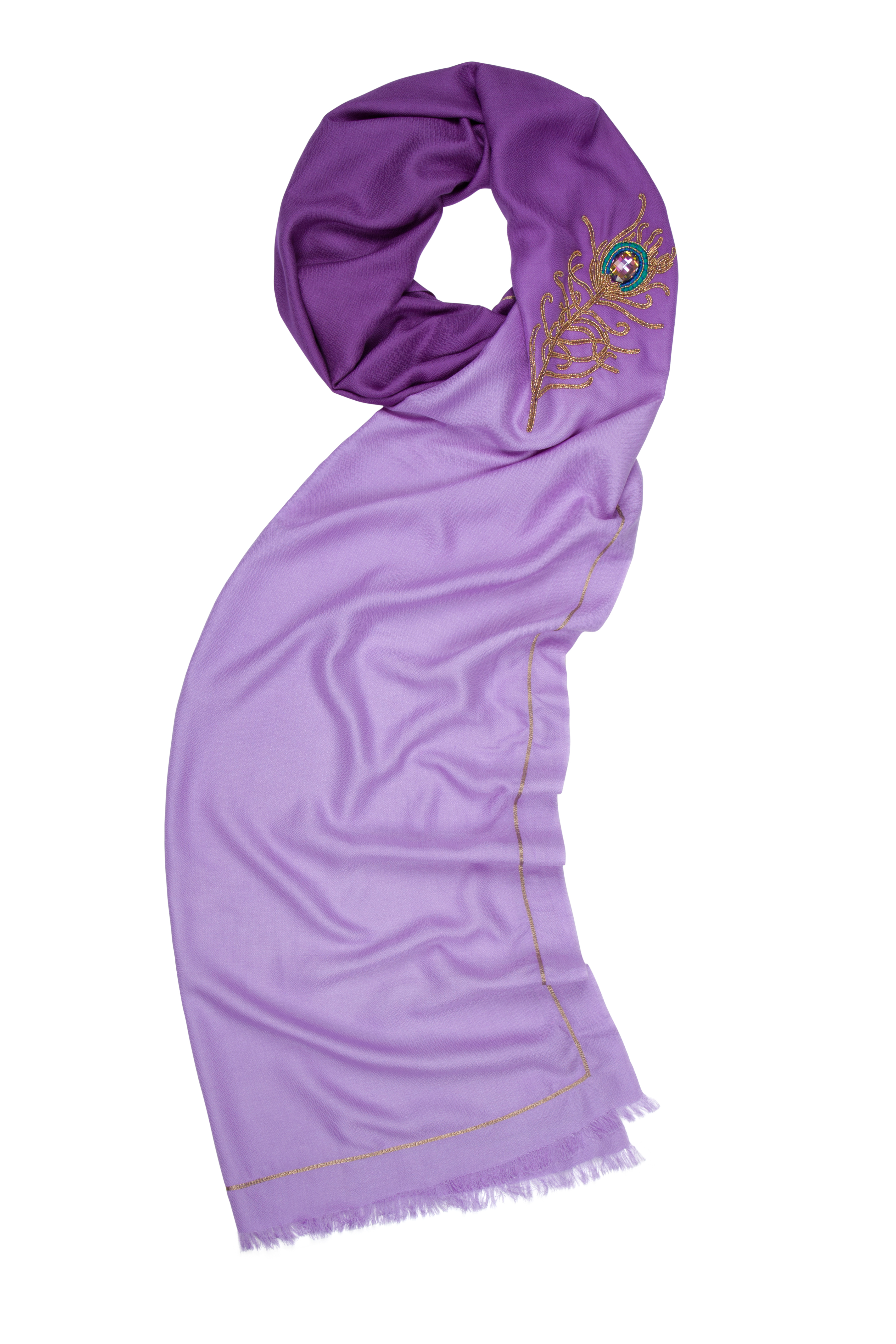 This scarf has been lovingly hand-made in India by skilled Indian artisans, made from a fine weave blend of cashmere and modal, hand-dyed, with an ombré finished and an intricate, gold embroidered feather, completed with a beaded glass crystal, and a fine gold weave trim.