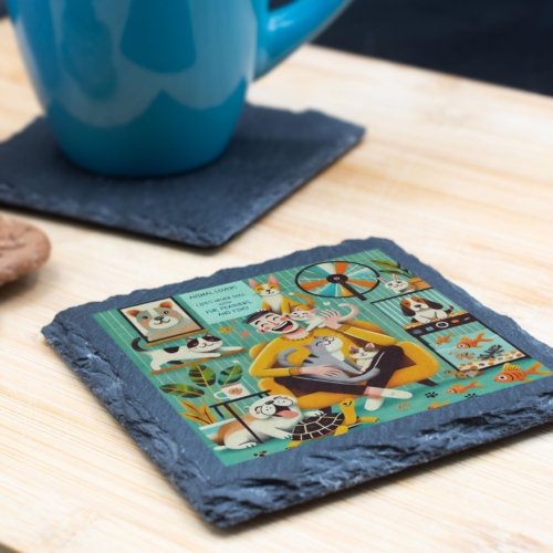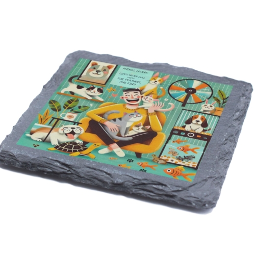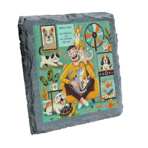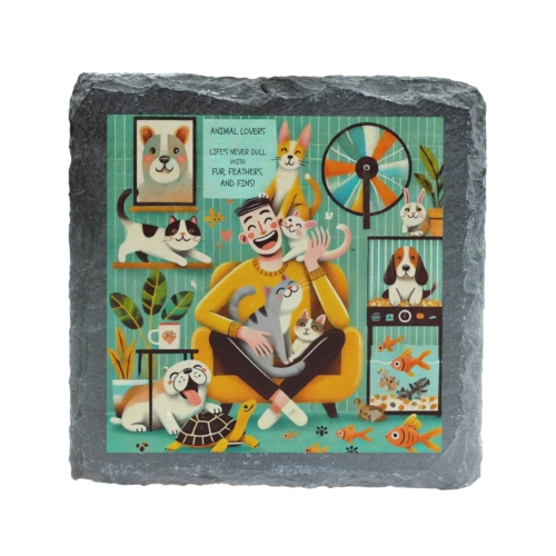 Celebrate the joy and chaos of life with animals with the “Animal Lover’s Life” Slate Coaster. This playful and heartwarming design features a variety of pets?from playful pups to curious cats, fish, and even turtles?highlighting the love and laughter that pets bring to our lives. Crafted from high-quality natural slate, this coaster is both functional and decorative. Whether you’re sipping coffee or displaying it as a cute accent piece, this coaster makes a delightful addition to any pet lover’s collection. It?s the perfect gift for anyone who can?t imagine life without their furry, feathered, or finned companions! Adorable Pet Design: Features a charming illustration of animals, including cats, dogs, fish, and more, with the quote: “Lifeâs never dull with fur, feathers, and fins.” Durable Slate Construction: Made from premium natural slate to protect your surfaces from spills and scratches. Perfect for Animal Lovers: A heartwarming addition to any pet owner’s home or office, celebrating the joy of pets. Thoughtful Gift: Ideal for pet parents, animal advocates, and anyone who loves furry (or not-so-furry) friends. Multi-Purpose: Use it as a coaster for drinks, a decorative piece, or even a small trivet for hot items.
