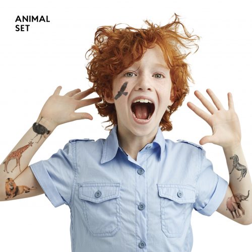 Hear them roar! Set of wild just like real animal temporary tattoos is made for children (of any age up to 99) or a family fun weekend in the zoo.