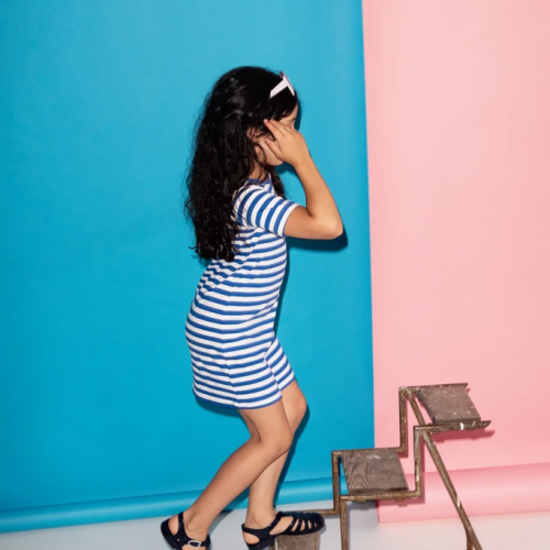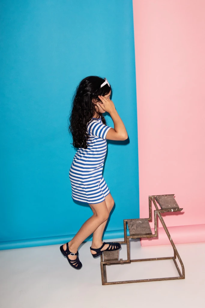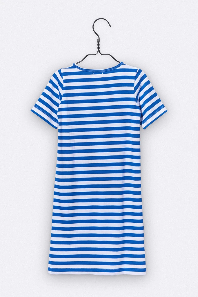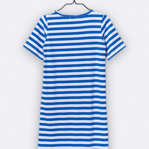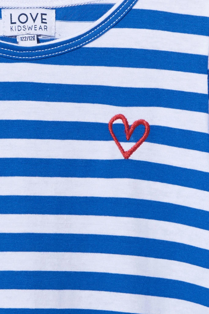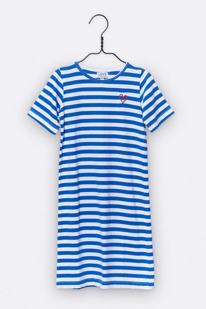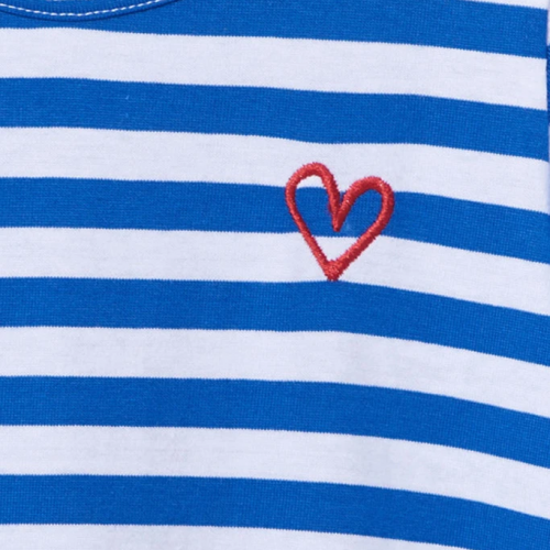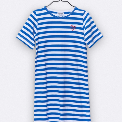 The Anna dress is a basic t-shirt dress with a little twist. Made of blue and white striped cotton and our signature red heart embroidery, it is the perfect dress for any occasion.
