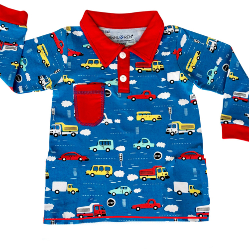 AnnLoren Toddler & Big Boys Long Sleeve Polo Shirt. Red collar and pocket. Automobile design print with Cars, Trucks and Buses. Pair with your favorite pants. Soft superior 95% Cotton/5% Spandex stretch Egyptian cotton. Machine washable.