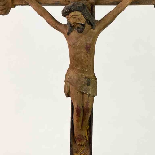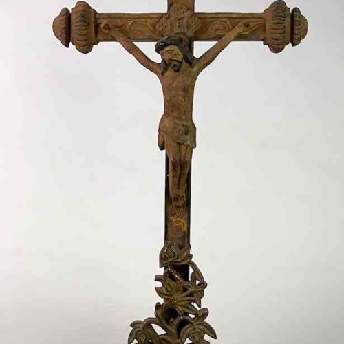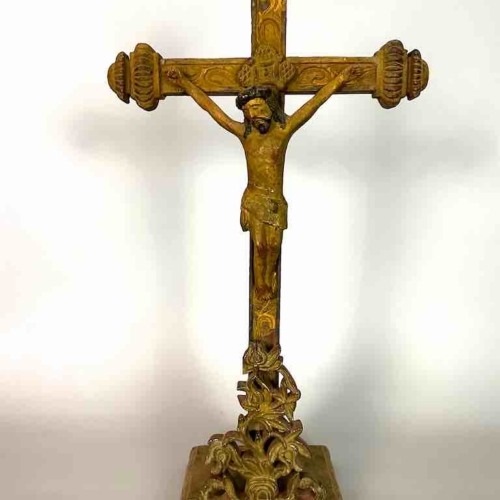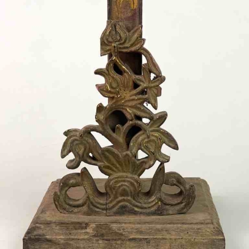 A beautiful antique item from Vietnam that reflects the Catholic presence of France in that country over 150 years ago. Since the early 1800’s France was heavily involved in Vietnam with the pretext of protecting Catholic missionaries. France continued to grow its new colony which eventually formed French Indochina in 1887. France continued to rule Vietnam as a colony until their defeat in the Indochina War which allowed Vietnam to claim independence in 1954. It is a widespread practice in Asia to have a religious shrine in one’s house: Buddhists have Buddhist shrines and Christians have Christian shrines. When a family is wealthy enough Buddhists will have a private temple in their house; Catholics a chapel. All of the ecclesiastical objects we have were component parts of such shrines/chapels. A family would de-acquisition an object only when the family believes the object no longer carries the significance it used to, when they find other objects of greater meaning or when they need the money. This crucifix measures: 27 x 13 1/2″ (69 x 34 cm)