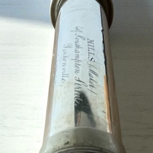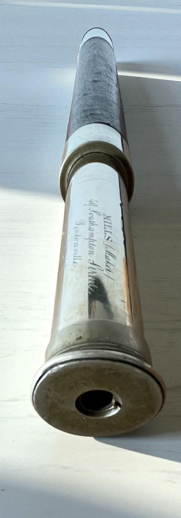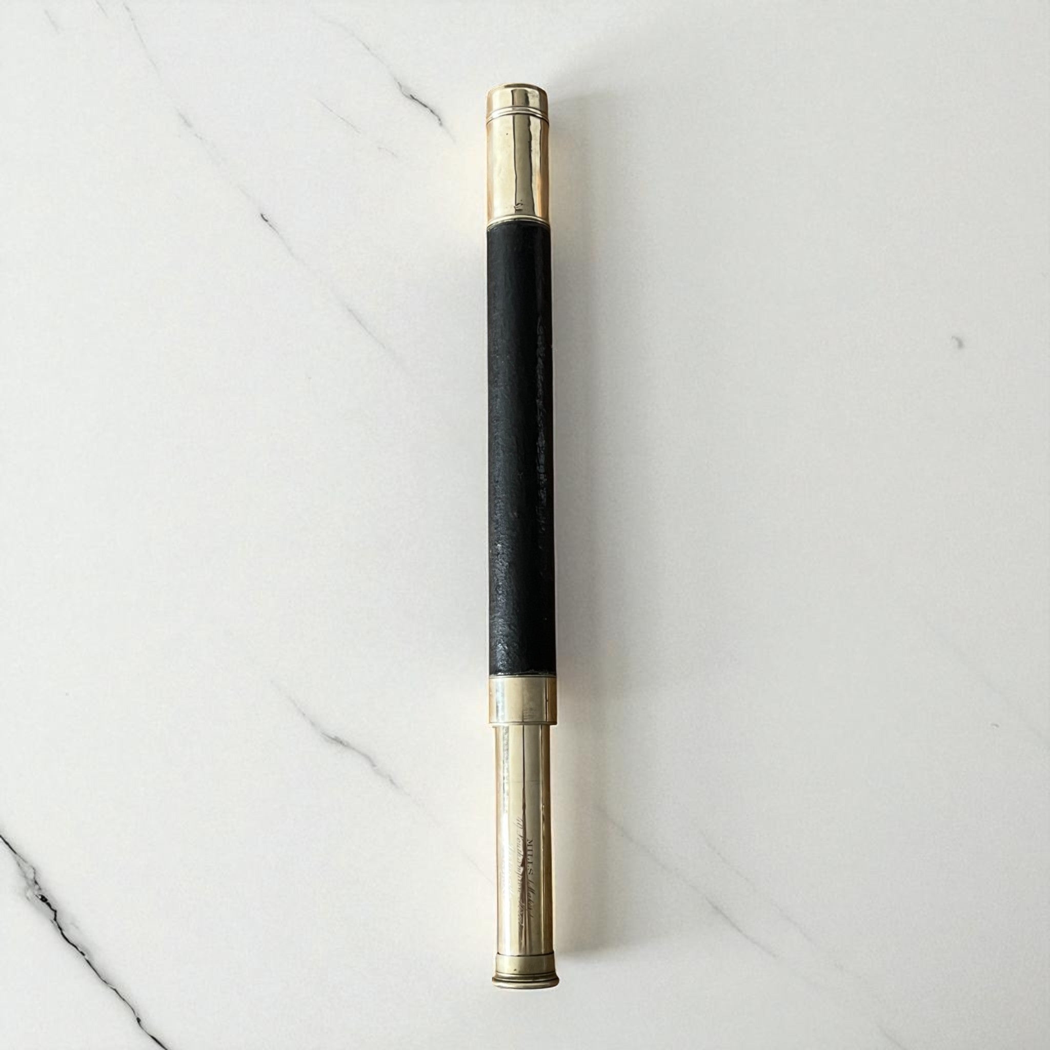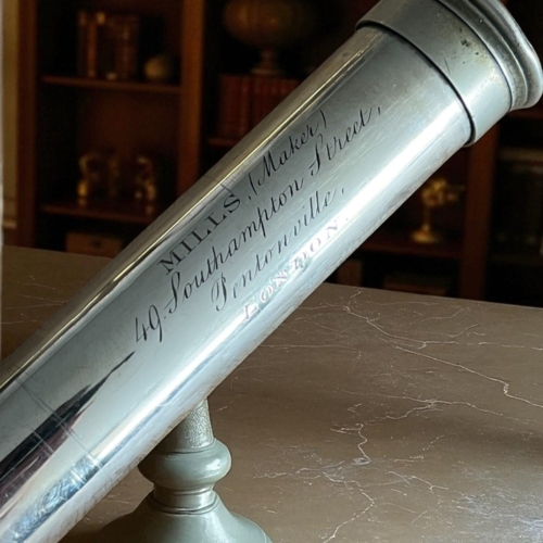 This antique telescope was crafted by Mills, Maker of 49 Southampton Street, Pentonville, London. Made from brass with a black leather wrapped barrel, it extends to 53 cm (about 20.8 inches) when fully opened and has a lens diameter of 3.5 cm (1.37 inches). The lens is in perfect, clear condition, ensuring a crisp view, while the body shows light age marks consistent with use. Well made and fully extendable, this is a fine example of British optical craftsmanship, ideal for collectors of maritime instruments, vintage decor enthusiasts, or as a unique historical gift.• Maker: Mills, London• Material: Brass, Chrome Plated & leather• Length (extended): 53 cm / 20.8 in• Lens diameter: 3.5 cm / 1.37 in• Condition: Clear lens, light age marks from use If you’d like more pictures or videos, please feel free to contact us.