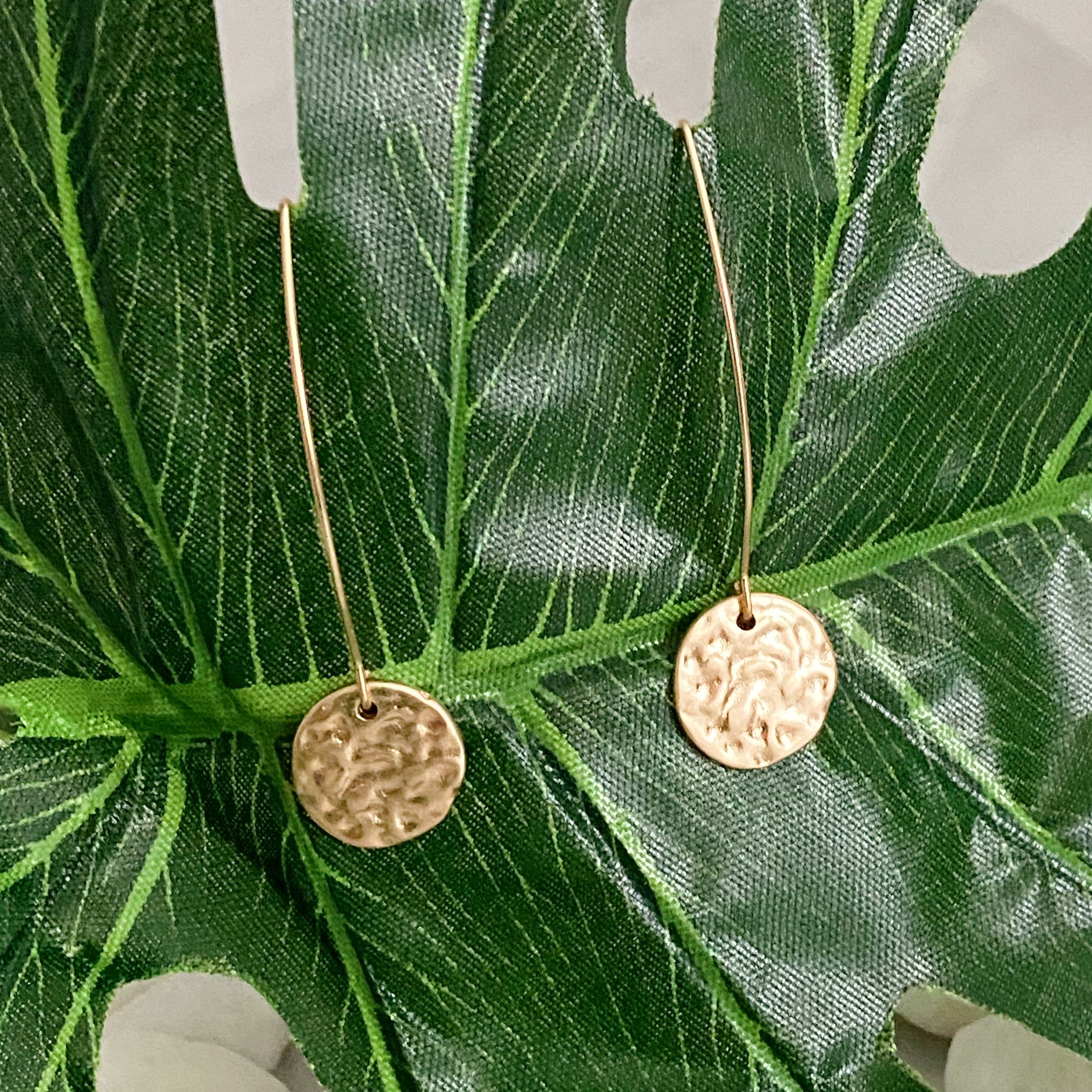 These Antique Moon Drop Earrings feature a fish hook with a unique antique finish disc for a stylish and lightweight look. Perfect for any occasion, their simple yet chic design is sure to elevate your look and make any ensemble stand out. Dimensions: approximately 2″ drop 18K Gold Plated plated Brass Lead and Nickel Free Made in China