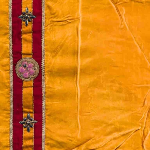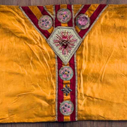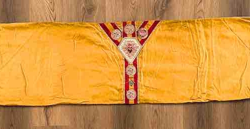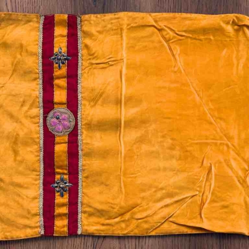 This vintage Vietnamese Catholic altar cloth features a central red modified cross featuring a central flaming heart. This would have decorated the front of the altar. This is an exceptionally beautiful early 20th century cloth and is among the oldest we have. Regrettably its condition reflects its age and use; it is very worn and somewhat stained. Most people associate Catholicism in Viet Nam with the French colonial period, which is very much the case. However, Jesuits from all over Europe brought Catholicism to Asia 500 years before that. The Catholic tradition in Viet Nam and all the other Catholic populations of Asia is well established. The Catholic population of Vietnam is only about 8% of the total but that is about 7 million people. During certain periods of their history Catholics have been some of the most influential people in the country. One of the largest concentrations of Catholics in Viet Nam is in the province of Nam Dinh, a short distance south of Hanoi, on the coast. Although we are unable to trace the origin of this exceptional chasuble there is a high probability that it comes from this area. We purchased this from a dealer in Hanoi. He most likely purchased it from dealers who are resident in the provinces. We have no way to ascertain the age of each piece but we are confident that, conservatively, it is at least 50 years old. It could very easily be much older; there is absolutely no doubt it is an authentic, vintage Vietnamese Catholic objects. We have a full range of Vietnamese Catholic ecclesiastical material: full saint figures in all sizes, crucifixes, tabernacles, shrine enclosures, a wide range of ecclesiastical textiles. We also have Vietnamese Buddhist objects as well. Please ask us for more information. Dimensions: 89.5 x 15.5″ (227 x 39 cm)
