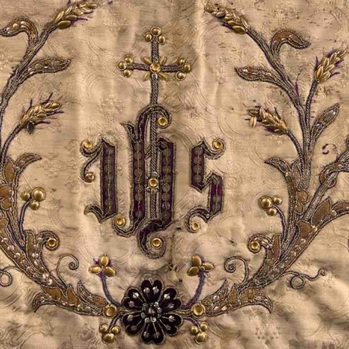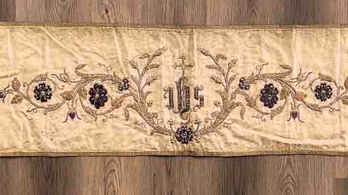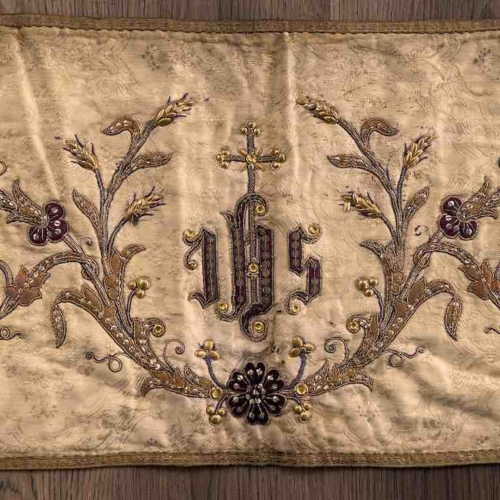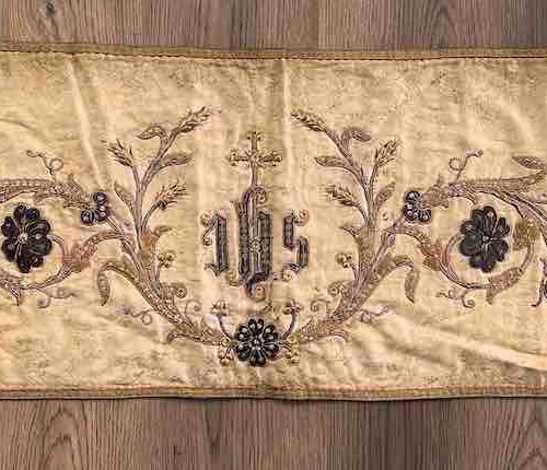 This vintage Vietnamese Catholic altar cloth features a central dark red Christogram IHS (the ancient symbol for Jesus Christ). A gold cross tops the Christogram. Around the IHS symbol are metallic wheat sprays. On each side of the central cluster are dark red flowers among embroidered vines. This would have decorated the front of the altar. This is an exceptionally beautiful early 20th century cloth and is among the oldest we have. Regrettably its condition reflects its age and use; it is very worn and somewhat stained. Most people associate Catholicism in Viet Nam with the French colonial period, which is very much the case. However, Jesuits from all over Europe brought Catholicism to Asia 500 years before that. The Catholic tradition in Viet Nam and all the other Catholic populations of Asia is well established. The Catholic population of Vietnam is only about 8% of the total but that is about 7 million people. During certain periods of their history Catholics have been some of the most influential people in the country. One of the largest concentrations of Catholics in Viet Nam is in the province of Nam Dinh, a short distance south of Hanoi, on the coast. Although we are unable to trace the origin of this exceptional chasuble there is a high probability that it comes from this area. We purchased this from a dealer in Hanoi. He most likely purchased it from dealers who are resident in the provinces. We have no way to ascertain the age of each piece but we are confident that, conservatively, it is at least 50 years old. It could very easily be much older; there is absolutely no doubt it is an authentic, vintage Vietnamese Catholic objects. We have a full range of Vietnamese Catholic ecclesiastical material: full saint figures in all sizes, crucifixes, tabernacles, shrine enclosures, a wide range of ecclesiastical textiles. We also have Vietnamese Buddhist objects as well. Please ask us for more information. Dimensions: 73 x 15 1/4″ (185 x 39 cm)