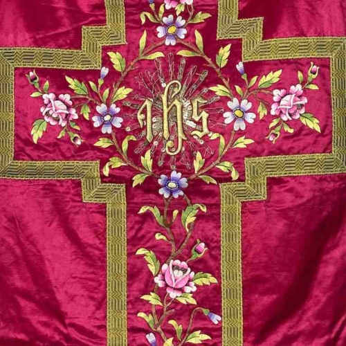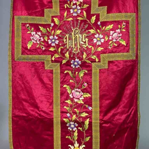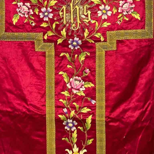 This vintage Vietnamese Catholic red silk chasuble features a central gold-embroidered Christogram IHS (the ancient symbol for Jesus Christ) as well as multiple floral designs in silk embroidery. Its condition is quite good, though not perfect, considering its age and how much it was used. Most people associate Catholicism in Viet Nam with the French colonial period, which is very much the case. However, Jesuits from all over Europe brought Catholicism to Asia 500 years before that. The Catholic tradition in Viet Nam and all the other Catholic populations of Asia is well established. The Catholic population of Vietnam is only about 8% of the total but that is about 7 million people. During certain periods of their history Catholics have been some of the most influential people in the country. One of the largest concentrations of Catholics in Viet Nam is in the province of Nam Dinh, a short distance south of Hanoi, on the coast. Although we are unable to trace the origin of this exceptional chasuble there is a high probability that it comes from this area. We purchased this from a dealer in Hanoi. He most likely purchased it from dealers who are resident in the provinces. We have no way to ascertain the age of each piece but we are confident that, conservatively, it is at least 50 years old. It could very easily be much older; there is absolutely no doubt it is an authentic, vintage Vietnamese Catholic objects. We have a full range of Vietnamese Catholic ecclesiastical material: full saint figures in all sizes, crucifixes, tabernacles, shrine enclosures, a wide range of ecclesiastical textiles. We also have Vietnamese Buddhist objects as well. Please ask us for more information. This front of this chasuble measures 39 1/2 x 24 1/2″ (100 x 62 cm); the back 28 x 22 3/4″ (71 x 58 cm). The overall length is 74 1/2″ (189 cm)