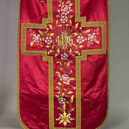 This vintage Vietnamese Catholic red silk chasuble features a central gold-embroidered Christogram IHS (the ancient symbol for Jesus Christ) as well as multiple floral designs in silk embroidery. Its condition is quite good, though not perfect, considering its age and how much it was used. Most people associate Catholicism in Viet Nam with the French colonial period, which is very much the case. However, Jesuits from all over Europe brought Catholicism to Asia 500 years before that. The Catholic tradition in Viet Nam and all the other Catholic populations of Asia is well established. The Catholic population of Vietnam is only about 8% of the total but that is about 7 million people. During certain periods of their history Catholics have been some of the most influential people in the country. One of the largest concentrations of Catholics in Viet Nam is in the province of Nam Dinh, a short distance south of Hanoi, on the coast. Although we are unable to trace the origin of this exceptional chasuble there is a high probability that it comes from this area. We purchased this from a dealer in Hanoi. He most likely purchased it from dealers who are resident in the provinces. We have no way to ascertain the age of each piece but we are confident that, conservatively, it is at least 50 years old. It could very easily be much older; there is absolutely no doubt it is an authentic, vintage Vietnamese Catholic objects. We have a full range of Vietnamese Catholic ecclesiastical material: full saint figures in all sizes, crucifixes, tabernacles, shrine enclosures, a wide range of ecclesiastical textiles. We also have Vietnamese Buddhist objects as well. Please ask us for more information. This front of this chasuble measures 39 1/2 x 24 1/2″ (100 x 62 cm); the back 28 x 22 3/4″ (71 x 58 cm). The overall length is 74 1/2″ (189 cm)