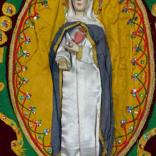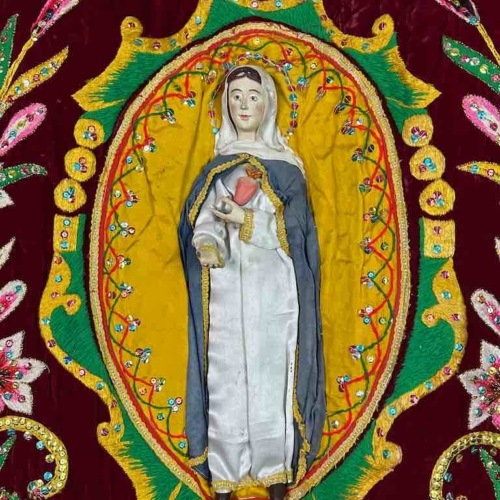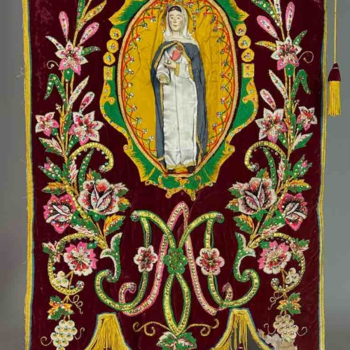 This vintage Vietnamese Catholic banner features a central figure of the Virgin Mary with a Sacred Heart and both hands outstretched. The head, hands, shoes and the heart are hand-carved wood. The thumb of the right hand is missing. The banner is velvet, intricately embroidered with a variety of floral designs of silk threads in a range of colors. Although not in perfect condition it is in an excellent state of wear considering its age. The embroidery on the back of the banner features the year 1961 which dates this to that year. The words translate to “Central Hoi, Phu Hoa Lake in Thinh Long”. Most people associate Catholicism in Viet Nam with the French colonial period, which is very much the case. However, Jesuits from all over Europe brought Catholicism to Asia 500 years before that. The Catholic tradition in Viet Nam and all the other Catholic populations of Asia is well established. The Catholic population of Vietnam is only about 8% of the total but that is about 7 million people. During certain periods of their history Catholics have been some of the most influential people in the country. One of the largest concentrations of Catholics in Viet Nam is in the province of Nam Dinh, a short distance south of Hanoi, on the coast. Although we are unable to trace the origin of this exceptional chasuble there is a high probability that it comes from this area. We have a full range of Vietnamese Catholic ecclesiastical material: full saint figures in all sizes, crucifixes, tabernacles, shrine enclosures, a wide range of other ecclesiastical textiles. We also have Vietnamese Buddhist objects as well. Please ask us for more information. The banner measures 53″ long, including the fringe x 27 1/2″ wide (135 x 70 cm); the Mary figure is 14 1/4″ tall (36 cm)