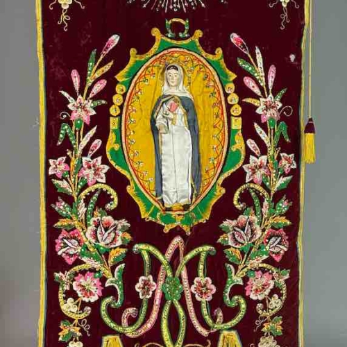 This vintage Vietnamese Catholic banner features a central figure of the Virgin Mary with a Sacred Heart and both hands outstretched. The head, hands, shoes and the heart are hand-carved wood. The thumb of the right hand is missing. The banner is velvet, intricately embroidered with a variety of floral designs of silk threads in a range of colors. Although not in perfect condition it is in an excellent state of wear considering its age. The embroidery on the back of the banner features the year 1961 which dates this to that year. The words translate to “Central Hoi, Phu Hoa Lake in Thinh Long”. Most people associate Catholicism in Viet Nam with the French colonial period, which is very much the case. However, Jesuits from all over Europe brought Catholicism to Asia 500 years before that. The Catholic tradition in Viet Nam and all the other Catholic populations of Asia is well established. The Catholic population of Vietnam is only about 8% of the total but that is about 7 million people. During certain periods of their history Catholics have been some of the most influential people in the country. One of the largest concentrations of Catholics in Viet Nam is in the province of Nam Dinh, a short distance south of Hanoi, on the coast. Although we are unable to trace the origin of this exceptional chasuble there is a high probability that it comes from this area. We have a full range of Vietnamese Catholic ecclesiastical material: full saint figures in all sizes, crucifixes, tabernacles, shrine enclosures, a wide range of other ecclesiastical textiles. We also have Vietnamese Buddhist objects as well. Please ask us for more information. The banner measures 53″ long, including the fringe x 27 1/2″ wide (135 x 70 cm); the Mary figure is 14 1/4″ tall (36 cm)