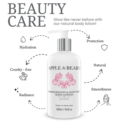 – PETA Cruelty Certified & Vegetarian Society Approved: APPLE & BEAR is dedicated to moral and sustainable business practices. Our body lotion, Pomegranate & Aloe Vera, has received PETA Cruelty Approval and Vegetarian Society 100% Vegan Certified.