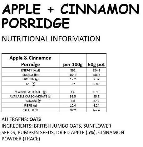 British grown jumbo oats, sunflower seeds and pumpkin seeds, dried apple and cinnamon. High in zinc, magnesium and plant based omega 3.