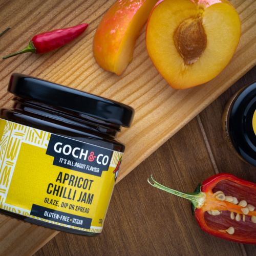 Apricot Chilli Jam Introducing Goch & Co.’s delicately flavoured Apricot Chilli Jam – the perfect blend of mild heat, sweet and tart overtones, and versatility. This jam is a delicious addition to any meal, served as a spread, dip or glaze, and condiment. Pair Apricot Chilli Jam with cheese and cured meat platters, pâté, and terrines for a flavourful punch. Or add Apricot Chilli Jam to your pork, poultry, and game dishes for a delightful twist. You can even use Apricot Chilli Jam to enhance the taste of hot drinks, bakes, and smoothies. Made with natural ingredients, this Apricot Chilli Jam is perfect for those who love a little bit of heat without overpowering their taste buds. Whether you’re a spice-lover or just looking to add some flavour to your dishes, this Apricot chilli jam is the perfect addition to your pantry. Experience the delicious taste of Goch & Co.’s delicately flavoured Apricot chilli jam today. Order now and take your meals to the next level! Gluten-free. No GM. No GMS. Vegetarian. Vegan. No Artificial Additives. Recyclable pack. Made in Wales, UK. Heat Level: Mild Servings per 100g: 20 Each Serving: 5g Ingredients: Apricots (45%); Sugar, Chilli Peppers. Allergen Advice: For Allergens, including cereals containing gluten, see ingredients in BOLD. Nutrition:Typical Values 100g contains: Energy 810Kj/191Kcal Fat 0g of which Saturates 0g Carbohydrates 46g of which Sugars 46g Fibre 0.8g Protein 0.8g Salt 0g Country of origin: Wales, United Kingdom. Storage: Store in a cool and dry place.