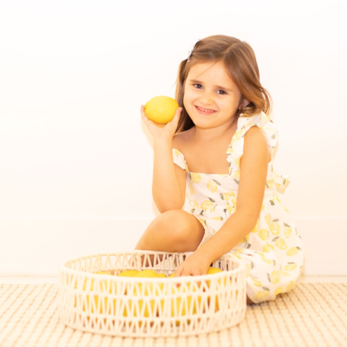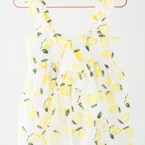 When life gives you lemons…The Apricot dress is the freshest pick for any celebration. The Apricot Fantasia dress has a beautiful white lemon fabric, adorned with fabric-made roses on chest. On the back there is a beautiful bow made on the same fabric.