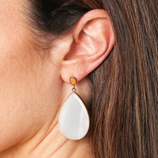Delicate pair of gold and aquamarine teardrop earringsPerfect to wear alone or stacked along with other accessoriesSecured with a simple round butterfly back for a comfortable fitAdd to a year round collection of colourful understated jewelleryDimensions: width 2.5cm x length 4.5cm x depth 0.2cmMade from: semi-precious stone, stainless steel