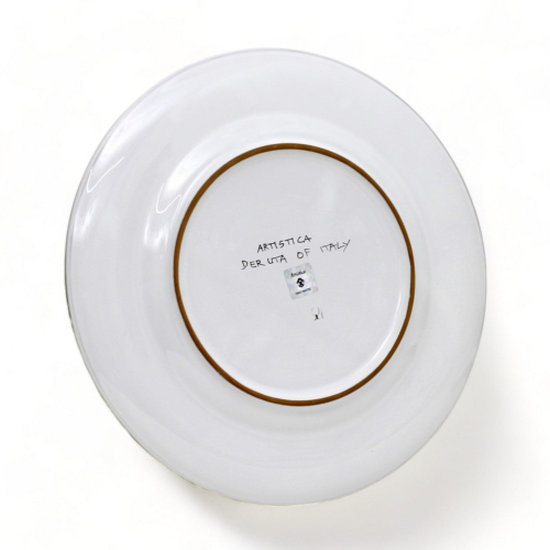 ARABESCO Collection The Deruta Arabesco design evokes Italian country charm and is one of the most popular patterns in Deruta, although its origins date back to a 17th-century Persian calligraphic pattern.The main motif is a whimsical bird, hand-painted in lively colors and surrounded by an abstract background of blue leaves.Arabesco is a distinctive and intricate design style that originated in Deruta, Italy, a town renowned for its rich tradition of ceramic craftsmanship.Deruta has been a center for Italian maiolica (tin-glazed earthenware) production since the Middle Ages, and the Arabesco design is one of the many unique patterns that emerged from this region. Arabesco, which translates to “Arabesque” in English, is characterized by its elaborate and flowing geometric patterns, often inspired by Islamic art and design.The style incorporates intricate interlacing lines, scrolls, and floral motifs, creating a mesmerizing and harmonious visual effect; the design reflects the influence of the Arab world on Italian ceramics, showcasing a blend of cultural and artistic elements.The Arabesco design not only highlights the craftsmanship of Deruta but also pays homage to the historical exchange of artistic influences between different cultures. Deruta’s ceramic tradition continues to thrive, and Arabesco remains a popular and timeless motif, appreciated for its intricate beauty and historical significance.Pieces featuring Arabesco designs are often sought after as both functional and decorative items, showcasing the enduring appeal of this unique Italian ceramic style.SIZE: 11.5″ DIAM. X 1″ HIGH