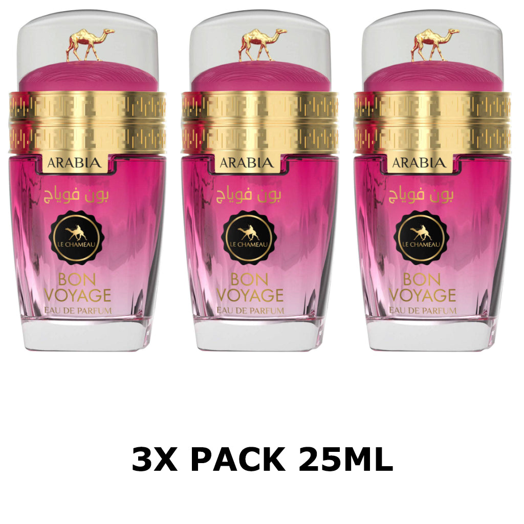 Arabia Bon Voyage – A sunny splash of peach and citrus invites you on a journey into a heart of caramel and jasmine, resting on warm amber and rich woods. Bright, adventurous, and irresistibly elegant. Head Notes: Peach, Mandarin Orange, Orange Heart Notes: Caramel, Orange Blossom, Jasmine Base Notes: Amber, Sandalwood, Guaiac Wood, Cedar