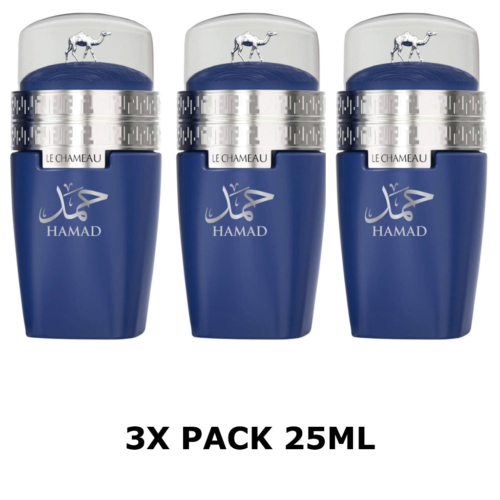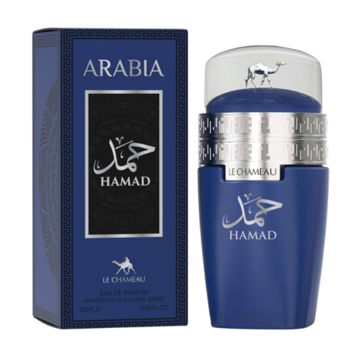 Arabia Hamad 25 ML EDP – 3-Pack By Le Chameau Arabia Hamad – A crisp citrus medley of grapefruit and bergamot sparks the senses, unfolding into a bold heart of spices and woods, resting on rich amber, leather, and vanilla. Commanding, fresh, and irresistibly masculine. Head Notes: Grapefruit, Lemon, Bergamot, Lime, Thyme, Artemisia, Galbanum Heart Notes: Vetiver, Juniper Berries, Black Currant, Apple, Pink Pepper, Cedar, Cypriol Oil Base Notes: Ambergris, Leather, Vanilla, Benzoin, Labdanum